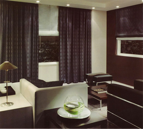 白い壁とは対照的な、ダークカラーのカーテンで、インテリア全体をシャープな印象に。 暗くなりすぎないよう、ホワイトカラーのシンプルなドラム式シェードを組み合わせて。